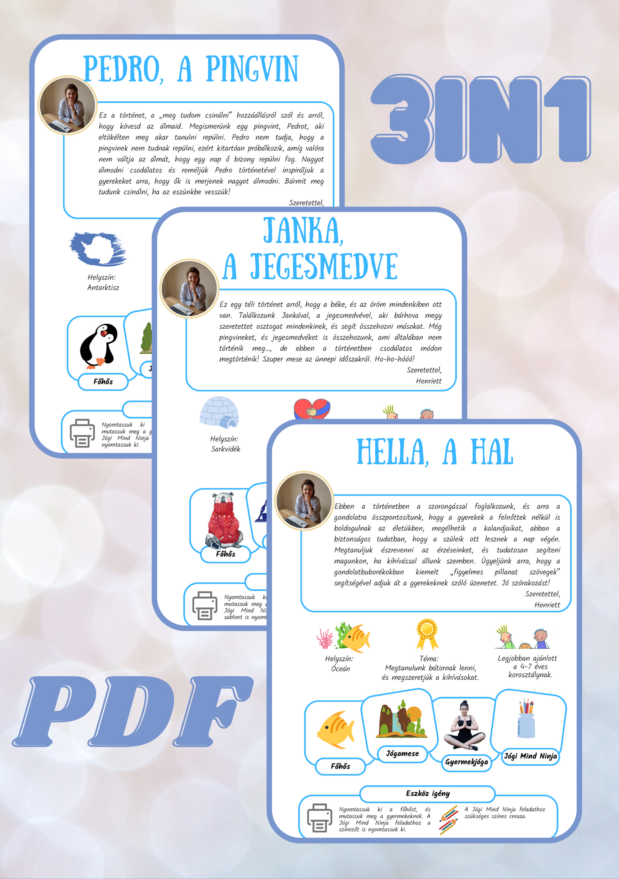 - Pedro, a pingvin (digitális termék), ami egy játékos gyermekjóga foglalkozás terv, melynek témája a kitartás, és, hogy merjünk álmodni. A foglalkozás terv 4 fő részből áll: a főhős bemutató képéből, a jógameséből, a gyermekjóga flowból, és egy Jógi Mind Ninja kreatív feladatlapból, melynek értéke 1.650 Ft